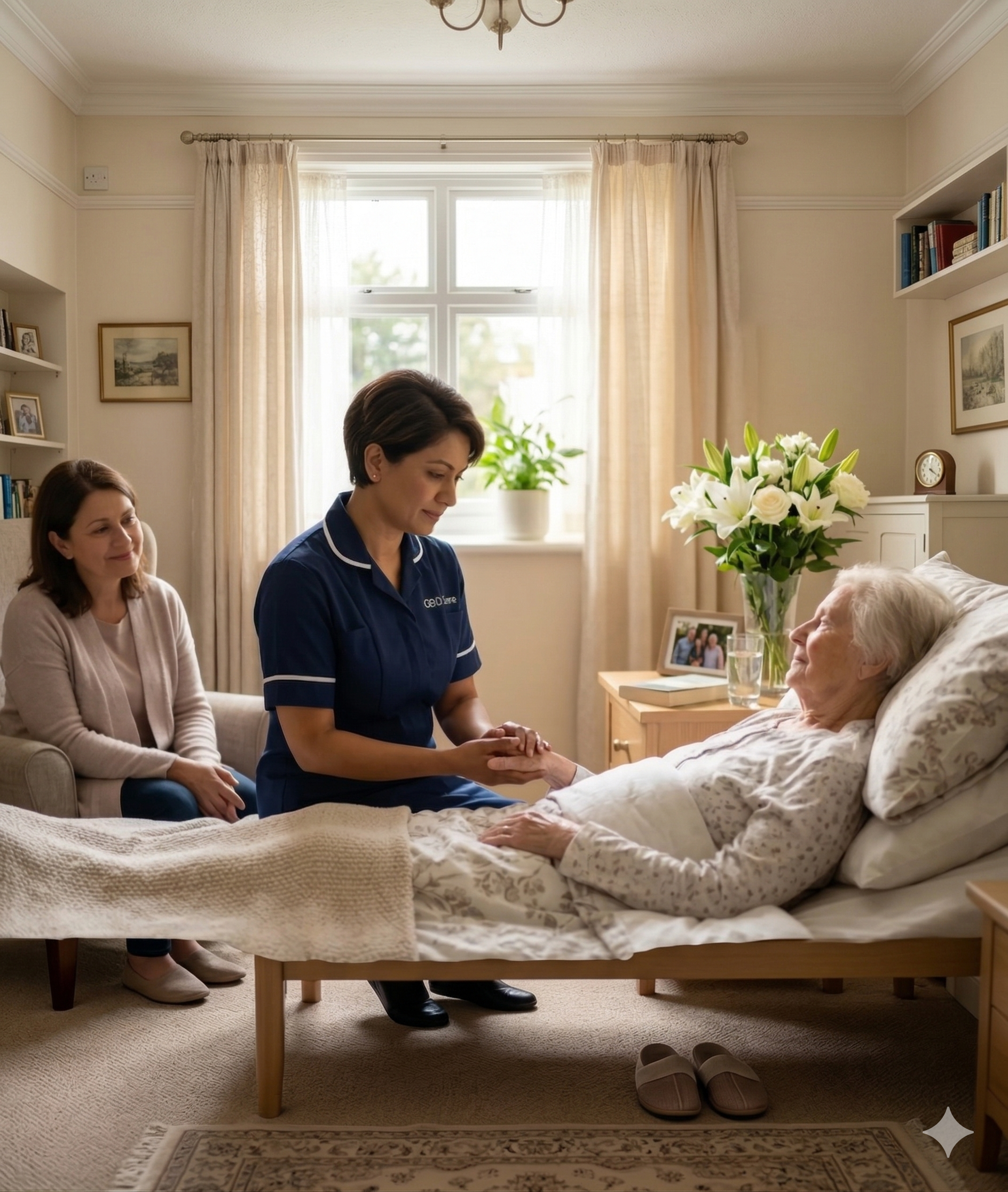 ![A GEG Care palliative carer coordinating with an NHS district nurse at a client's home in [LOCATION], ensuring seamless joined-up end-of-life care.](/palliative-care-joined-up.png)